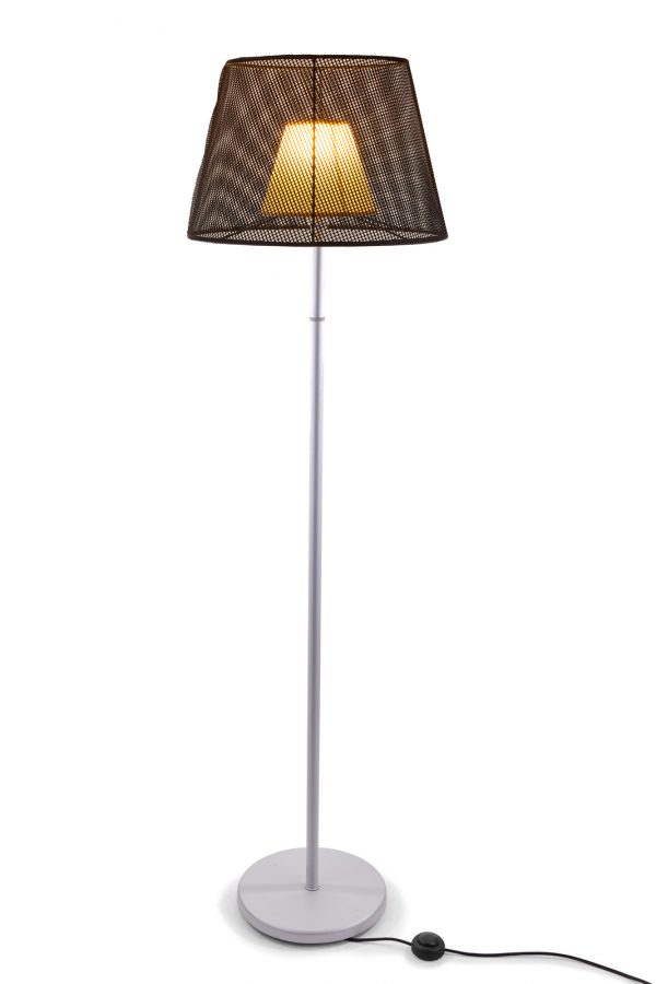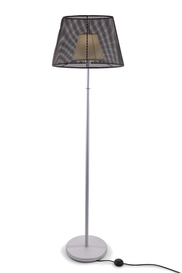 מנורת רצפה: בסיס ברזל מתכת בשלל צבעי RAL בתנור + משקולת ליציבות + אהיל קונוס רשת שחור + אהיל פנימי חומר קלף